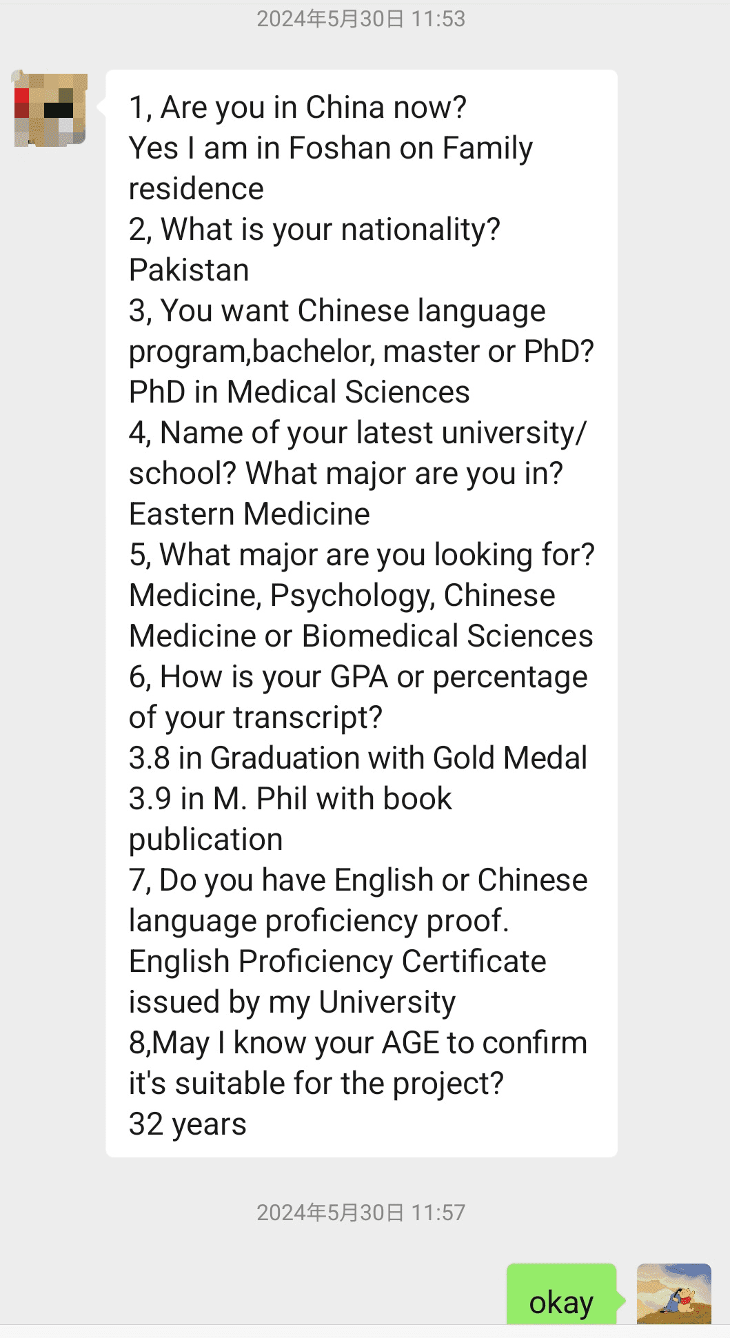 In May 2024, Sukhera watched a video shared by Mr. Su online, which offered insights into applying for international study in China. In the video, Mr. Su provided detailed explanations of the specialized features of Chinese universities, the advantages of different geographical locations, and application techniques. This proved to be an eye-opener for Sukhera, who had been struggling with choosing a university and navigating the application process. He immediately decided to contact our team, hoping to find an ideal university that could meet both his academic needs and allow him to balance his family responsibilities with the help of professional support.