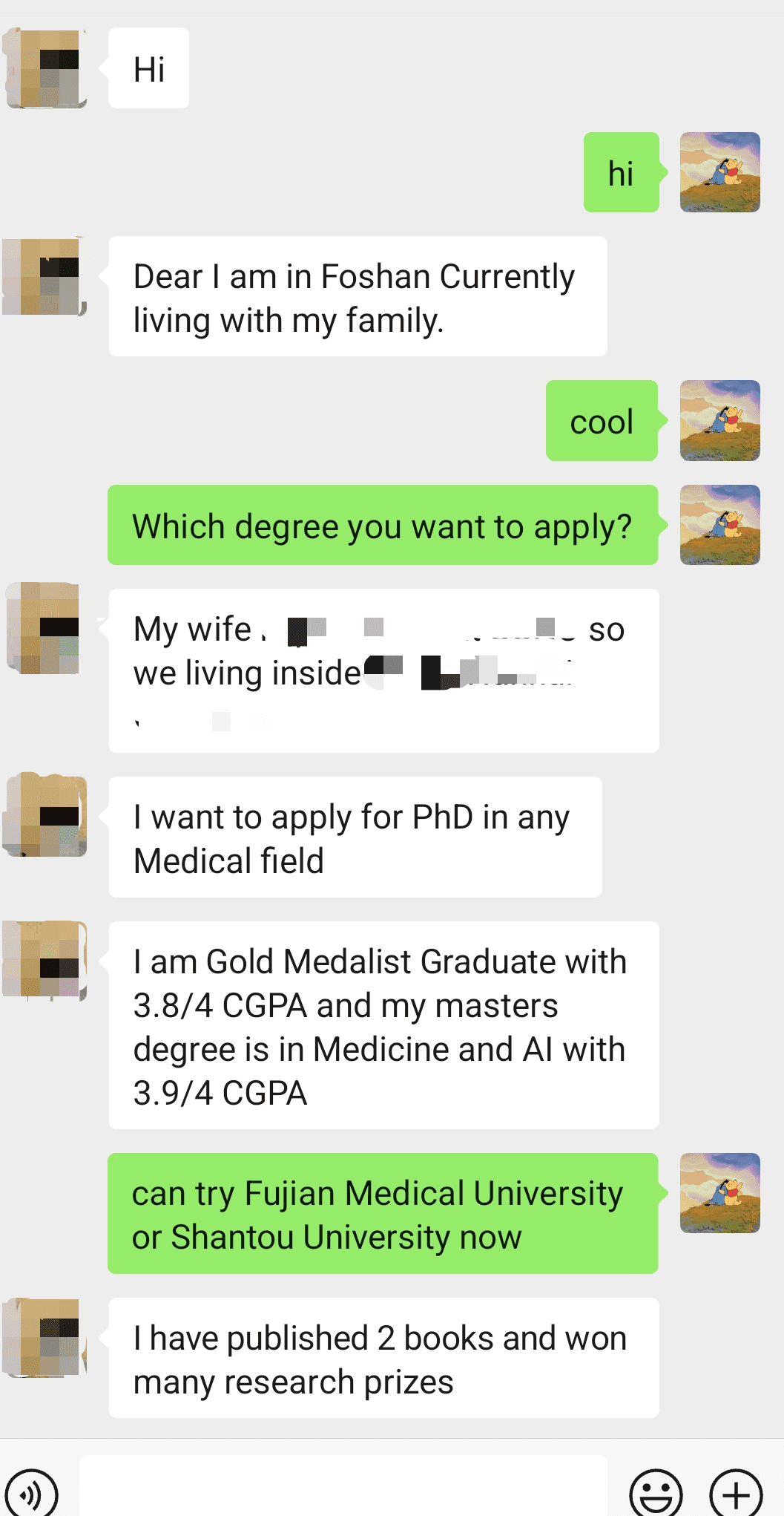Finally, on May 9, 2025, with only 11 days left until the May 20 deadline for HITSZ's application, good news arrived. Lulu successfully made contact with Professor Ma from HITSZ, who is highly accomplished in the field of Biomedical Engineering and whose research direction is highly consistent with Sukhera's academic interests. Lulu provided Professor Ma with a detailed introduction to Sukhera's high GPA, research experience, and sense of responsibility towards his family. Professor Ma showed great interest in Sukhera and immediately agreed to offer him an interview opportunity.
