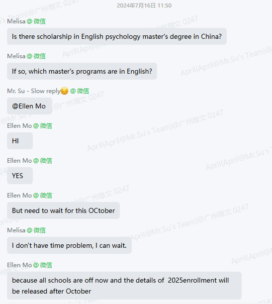 After fully understanding Melisa's academic background, application needs, and future career plans, Consultant Ellen, drawing on the team's years of experience in assisting international students with applications to study in China, conducted a preliminary analysis of the overall situation of English-taught master's programs in Psychology in China. Since Melisa contacted the team in mid-July 2024, it was already too late to apply for enrollment in September 2024. Therefore, the team recommended that she apply for enrollment in September 2025, and she readily agreed. In the early stage of the application process, the team carefully answered every question Melisa had, dispelling her concerns about being unfamiliar with the application process and admission policies. Impressed by Ellen's professional competence and patient attitude, Melisa wholeheartedly trusted Mr. Su's team and officially kicked off her journey of applying to study in China.