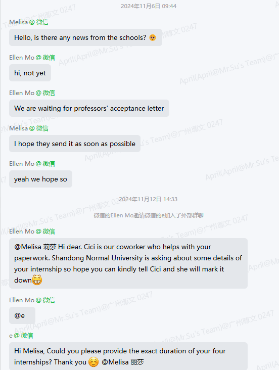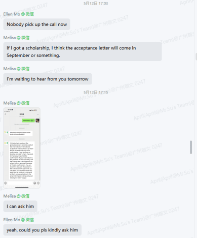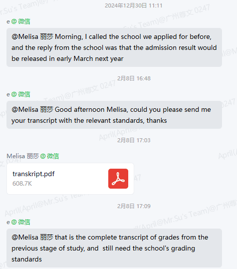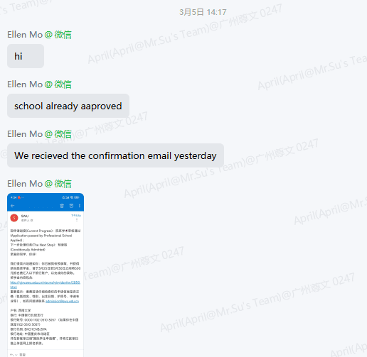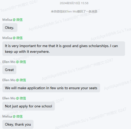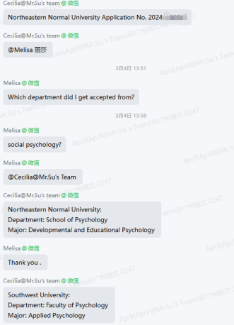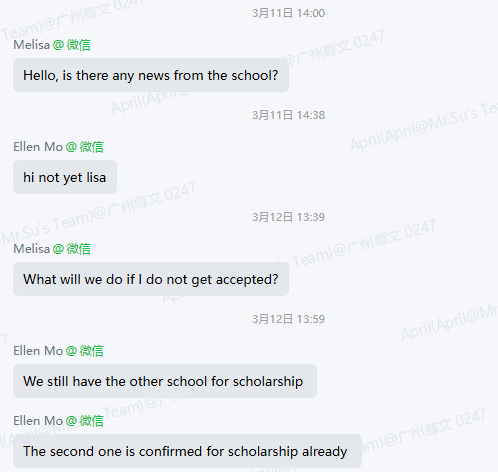 During the communication process, relying on professional communication skills and rich experience, Mr. Su's team repeatedly emphasized Melisa's suitability for the program and the team's emphasis on this application to the university. Consultant Ellen even had one-on-one communications with the teachers in charge of scholarship approval at Southwest University on multiple occasions, providing additional materials about Melisa to confirm her academic abilities and overall quality.