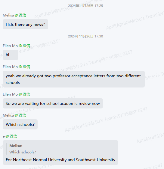 At the end of November 2024, good news arrived: Melisa successfully obtained acceptance letters from supervisors at two universities—Northeast Normal University and Southwest University. This achievement was not only a recognition of Melisa's own abilities but also a strong testament to the document writing skills and university communication capabilities of Mr. Su's team.
