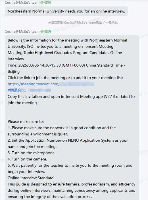 Next came the critical interview stage. For the interview at Northeast Normal University, Consultant Ellen formulated a detailed interview coaching plan for Melisa in advance, providing comprehensive training covering aspects such as sorting out common interview questions, consolidating professional knowledge, and improving English expression skills. Melisa performed exceptionally well in the interview and successfully passed two rounds of interviews. Regrettably, however, Northeast Normal University tended to admit students from Nordic countries at that time, so it could not recommend Melisa for the CSC (China Scholarship Council) scholarship, and only offered her the option of self-funded enrollment.