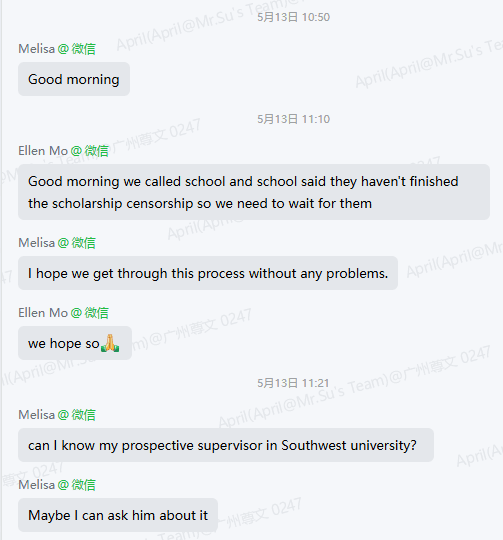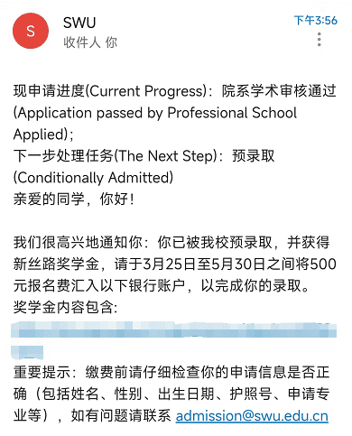 As time passed, it was not until the beginning of May 2025 that Southwest University suddenly informed Melisa that she had been awarded the New Silk Road Scholarship and required her to pay the relevant fees as soon as possible. However, there was still no update on the progress of her CSC scholarship application. This sudden situation confused Melisa and made Mr. Su's team realize that there might be an issue.