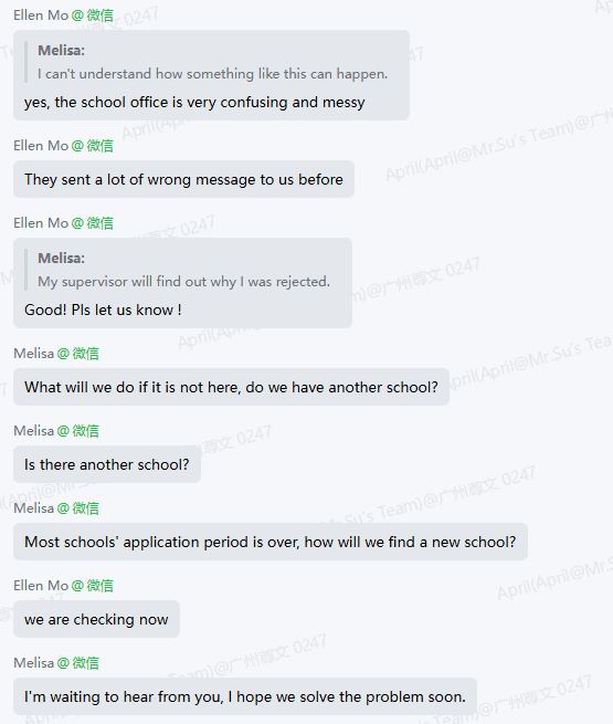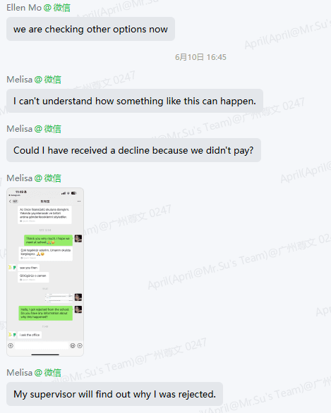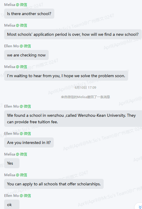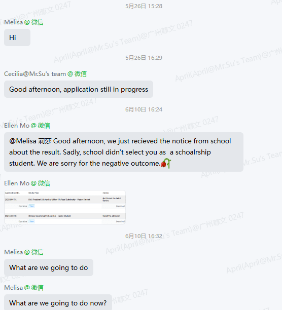 The team immediately activated the emergency response mechanism. Led by Mr. Su himself, with full support from Consultant Ellen, the team conducted in-depth communications with the supervisor and admission office staff of Southwest University through multiple channels. After extensive efforts, the team finally clarified the situation: on one hand, Melisa failed to pass the final selection for the CSC scholarship; on the other hand, due to a work error by the university staff, the information about the New Silk Road Scholarship was mistakenly sent to Melisa in advance, and the relevant approval process for the scholarship had not yet been completed at that time.