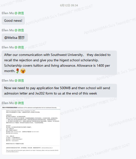 Their efforts finally paid off. After nearly half a month of unremitting efforts and multi-party coordination by Mr. Su's team, on June 12th, Southwest University finally agreed to award Melisa the full New Silk Road Scholarship, which not only covered her tuition fees but also provided partial living expenses. When Ellen informed Melisa of this good news, she was extremely excited and repeatedly expressed her gratitude to Mr. Su's team.