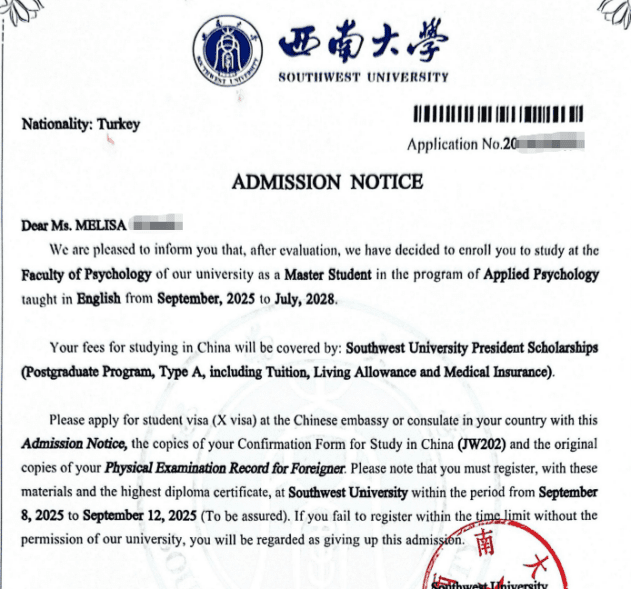 On the path of applying to study in China, every international student harbors a desire for academic advancement, and a professional application team is often the key force that helps them overcome obstacles and realize their dreams. Melisa, a student from Turkey, crossed paths with Mr. Su's team through a video. Eventually, under the team's full-process support, she successfully obtained a full scholarship for the Master's program in Psychology at Southwest University, embarking on a brand-new academic journey.